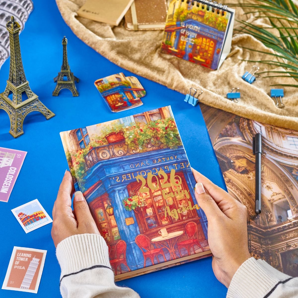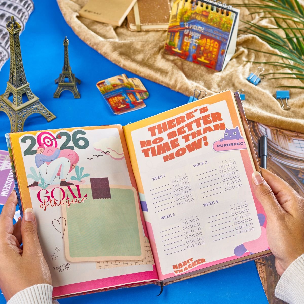 Inside the box you’ll find: a daily planner, weekly planner (52 sheets), mini inspiration stand (12 quotes), to-do list, stickers, bookmark, 2026 calendar, and 2 premium coasters — all available in 6 unique designs.